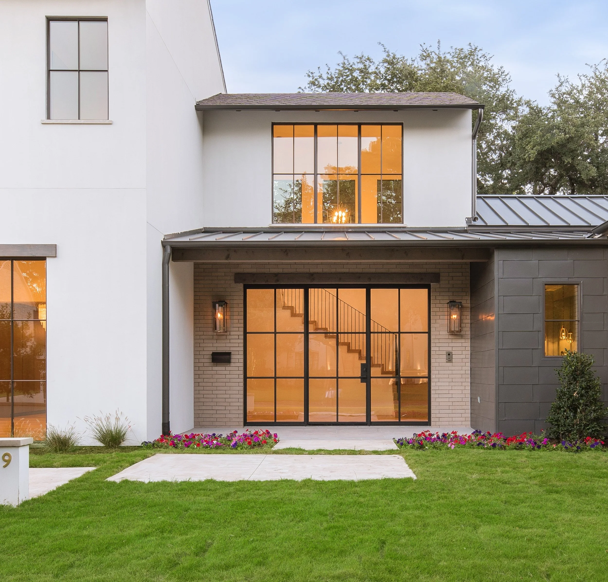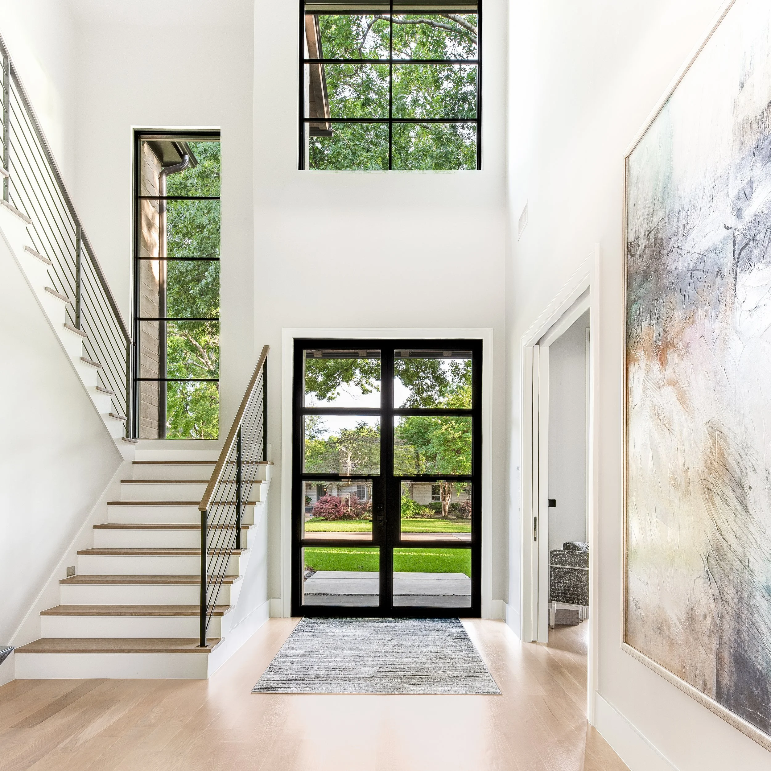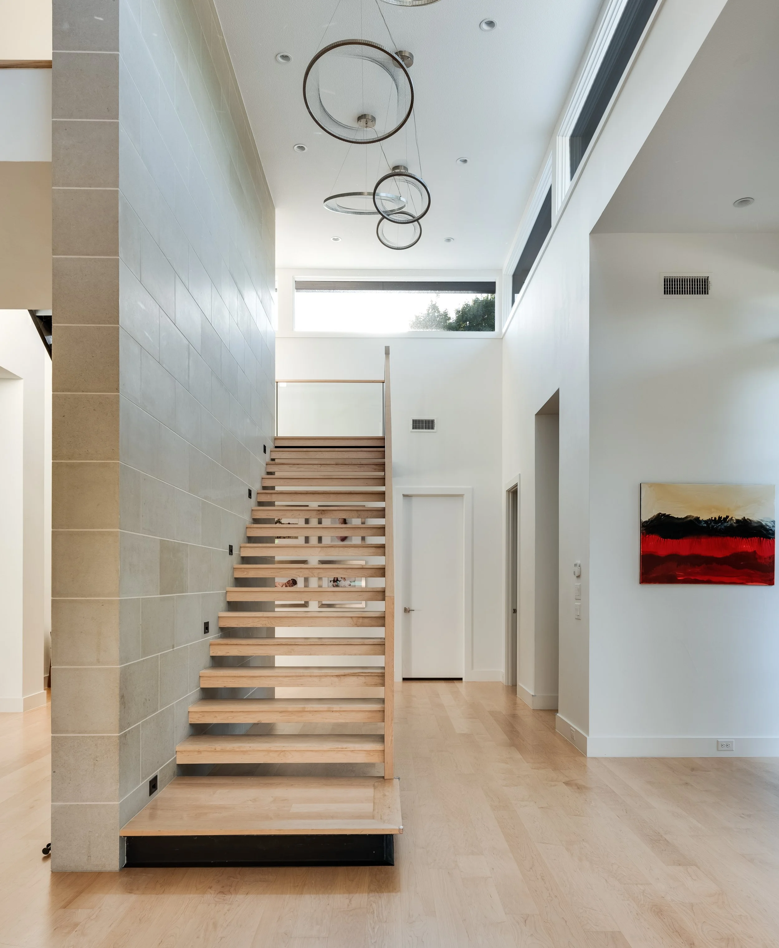 Large stairwell windows frame exterior views and integrate the home with its surroundings.Brings in Natural Light